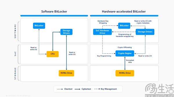 此次微软拿出的硬件加速BitLocker技术,则是通过专用硬件来“解放”CPU和硬盘。当设备满足特定条件时,BitLocker的批量加密密钥将被直接封装在硬件层,而非暴露于CPU或内存中,让CPU不再负责加解密工作。这一解决方案类似于图像渲染工作被交给显卡,是用专用硬件来解决特定的需求。