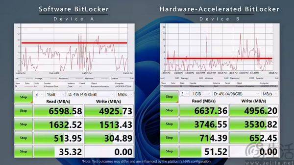 为了挽回自己在玩家中的印象分,微软近日发布了一项名为“硬件加速BitLocker”的技术,并宣称平均可节省70%的CPU使用率。按照微软方面的说法,硬件加速版BitLocker采用了XTS-AES-256算法,能够将加密运算从CPU加载到专用AES加密引擎中,从而释放CPU资源用于其他任务,此外还能提高设备的整体性能,并延长续航时间。