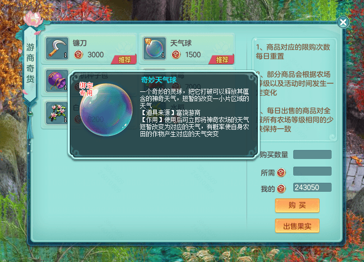 (1)新增富饶游商,每日9点-23点会随机出现在野外地图,使用神奇币可购买作物种子,以及镰刀、天气球等特殊商品;