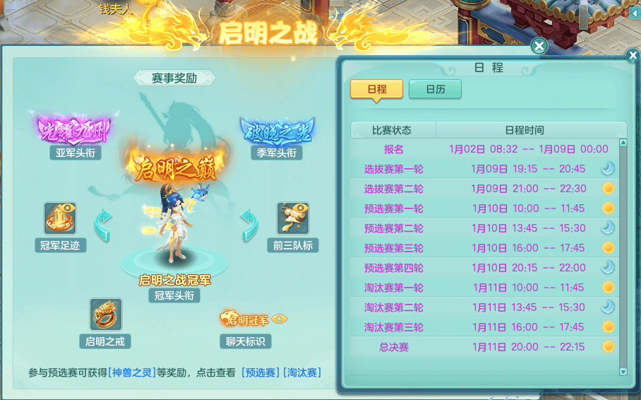(1)天选之战争霸赛将于1月9日开启,本周进行选拔赛与资格赛,详情可前往天选线)助手端登录的少侠也可前往天选真君处或打开助手观战大厅观看比赛。