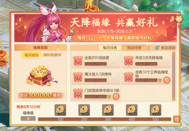 1月15日(下周四)0点开启,1月15日至21日可完成福缘宝箱任务。(2)福缘宝箱将分为