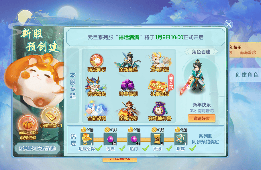 “福运满满”将于1月9日10点正式开启,现已开启角色预创建。系列服享神兽级萌宠团团、加码版新服神兽礼等数字