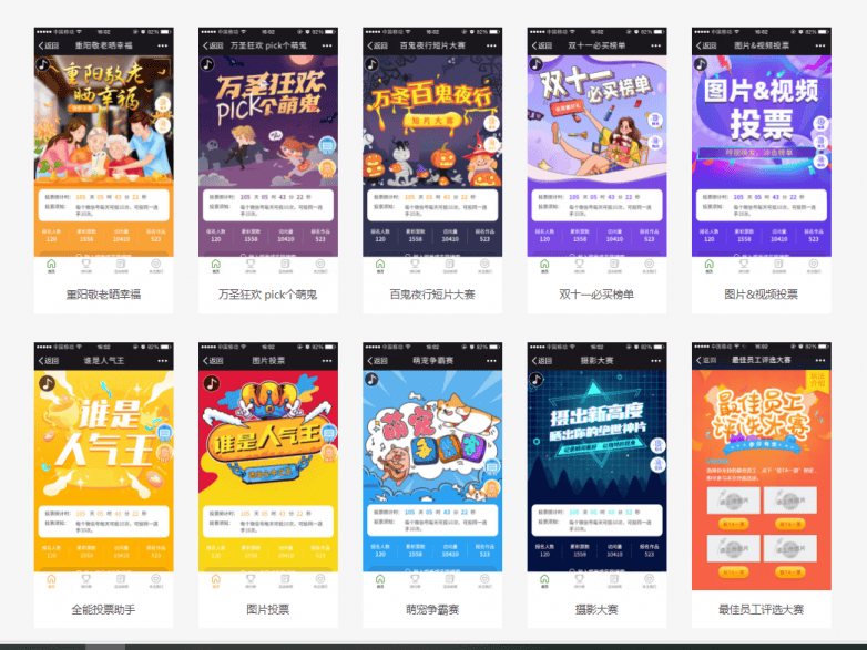 同时,平台还包含着许多不同主题、风格的投票小程序模板。每一款内设的小游戏啊、玩法都各不相同,可以满足各位多元化的需求!
