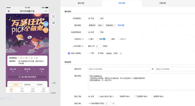 除了对活动标题、说明进行基础设置外,我们还可以对活动的报名、投票进行设置哇!