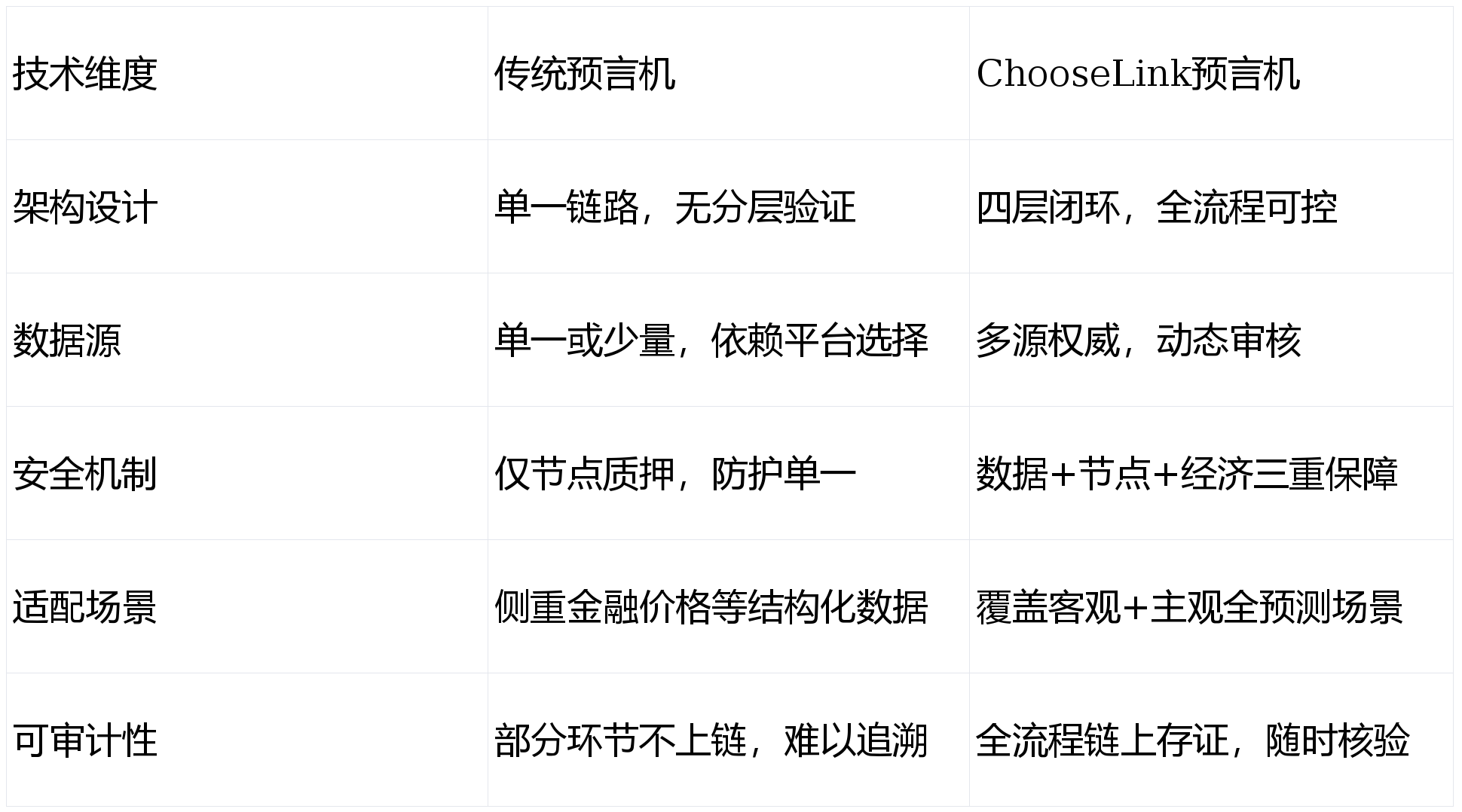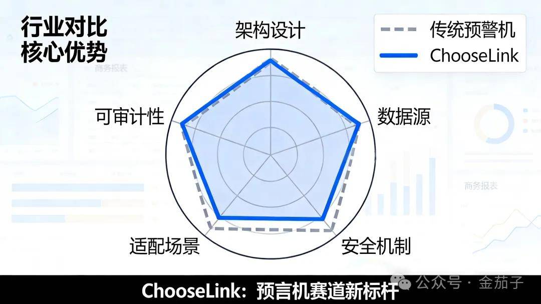在预言机赛道从“中心化”向“模块化、可验证”演进的趋势下,ChooseLink的出现具有里程碑意义。它不再是简单的“数据中继工具”,而是一套完整的“真相验证与执行系统”,相比传统预言机,其优势一目了然: