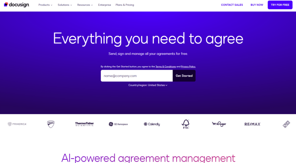 DocuSign 是全球电子签名市场的开拓者,其平台支持超过 1000 个第三方集成,拥有完善的 CLM 合同生命周期管理生态系统。它通过 AI 驱动的工具帮助用户在海量协议中进行语义搜索和条款提取,将静态的文档转变为可分析的数字化资产。