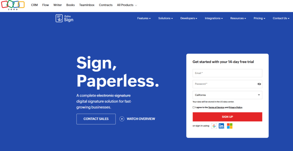 Zoho Sign 是一款面向全球市场的数字签名解决方案,属于 Zoho 庞大的企业应用生态系统。它支持 PDF、DOCX、PNG 等多种文件格式的签署,并严格遵守全球范围内的电子签名法律。该工具提供高强度的数据加密和传输保护,确保文档的私密性。